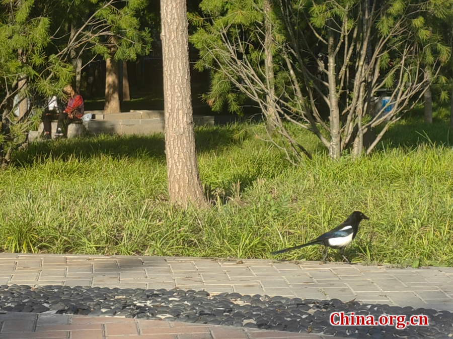 A magpie amid the lush greenery at Dinghui Park in Haidian district, Beijing, Oct. 13, 2025. [Photo by Liu Sitong/China.org.cn]