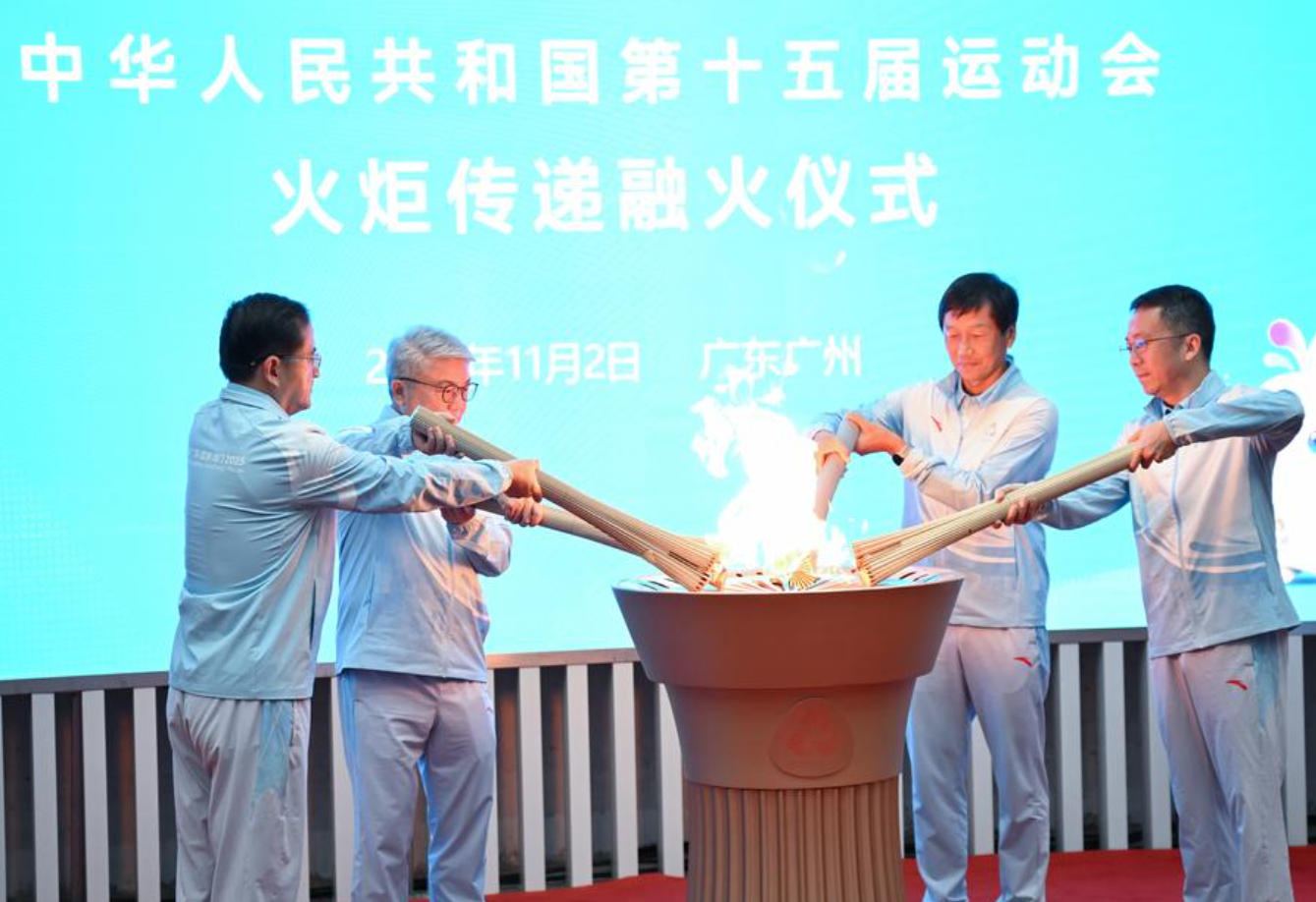 Four representatives light the cauldron during the torch merging ceremony for China's 15th National Games in Guangzhou, south China's Guangdong Province, Nov. 2, 2025. (Xinhua/Deng Hua)