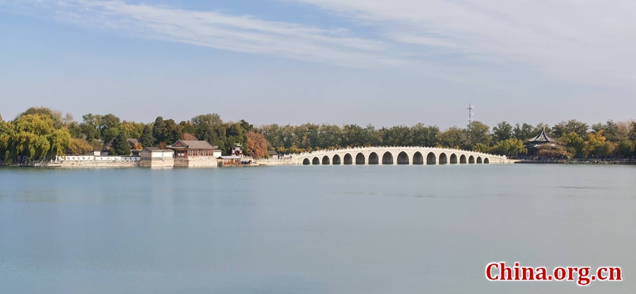 A photo taken on Nov. 10, 2025 shows the Summer Palace in Beijing featuring one of the several iconic bridges across Kunming Lake. The Seventeen-Arch Bridge (Shiqi Kong Qiao) is the most famous on the eastern side, and the Jade Belt Bridge (Yudai Qiao) on the western shore. These are popular viewing spots that offer a vantage point for photos, especially at sunrise or sunset when the arches are often reflected in the lake, with the mountains visible in the distance. [Photo by Lin Liyao/China.org.cn]