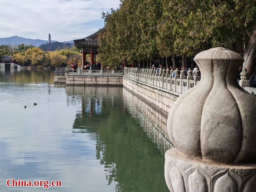 A photo taken on Nov. 10, 2025 shows the beautiful autumn scenery of the Summer Palace in Beijing. As well as history, a circuit route and natural beauty, the park offers panoramic, reflective views that visitors have come to associate with imperial gardens. The area remains a major attraction within Beijing's historic sites and water gardens. [Photo by Lin Liyao/China.org.cn]