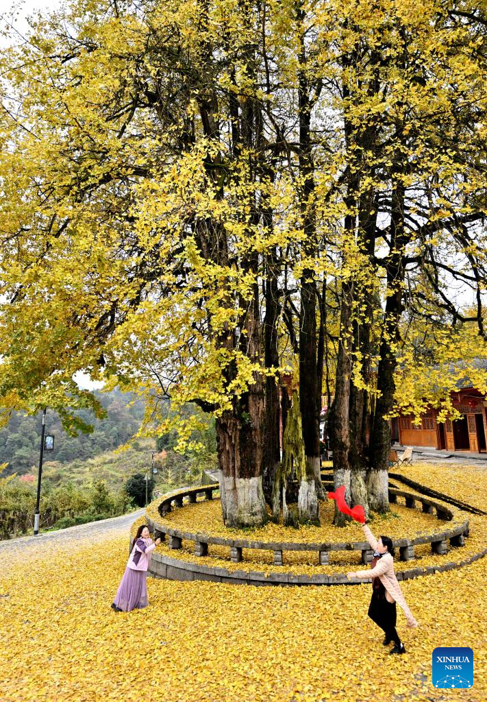 Tourists enjoy their time under ginkgo trees in Dongmenguan Village of Enshi Tujia and Miao Autonomous Prefecture, central China's Hubei Province, Nov. 14, 2025. (Photo by Song Wen/Xinhua)
