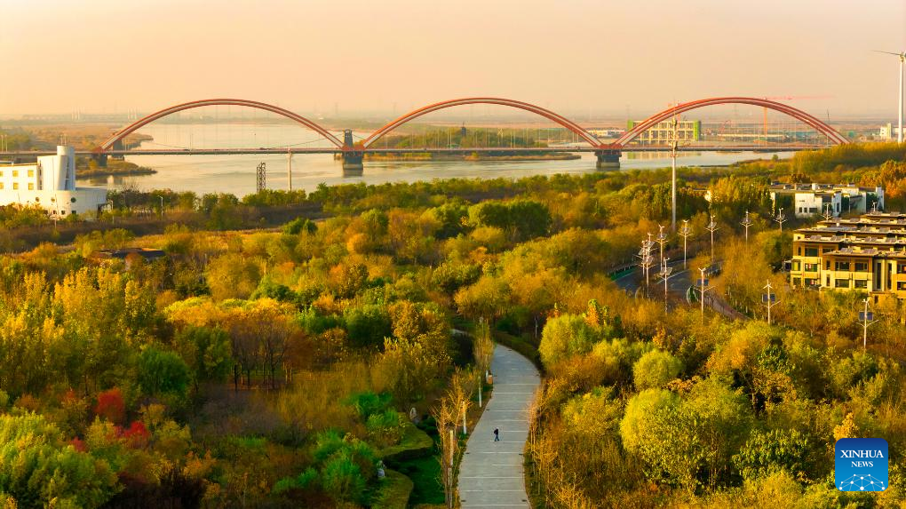 An aerial drone photo taken on Nov. 14, 2025 shows a view of the early winter scenery in Binhai New Area, north China's Tianjin Municipality. (Photo by Du Penghui/Xinhua)
