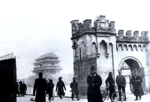 Uniformed foreign soldiers coming and going in the legation quarters.