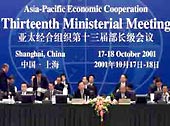 | The 13th Asia-Pacific Economic Cooperation(APEC) 2001 ministerial meeting opened at the International Convention Center in Shanghai on October 17, 2001. |