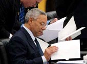 | US Secretary of State Colin Powell looks over documents at Asian-Pacific Economic Cooperation Ministerial Meeting in Shanghai on October 18, 2001. |