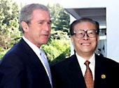 | Chinese President Jiang Zemin and US President George W. Bush held talks in Shanghai Friday morning. This was the first meeting between the two leaders.(10/19/2001)