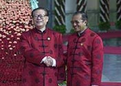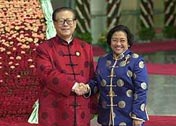 | Chinese Prsident Jiang Zemin and Indonesian President Megawati Soekarnoputri in Chinese-Style Costumes.(10/21/2001) |