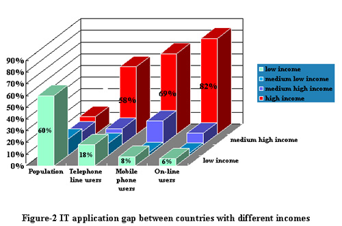 However, while IT has brought huge economic profits and social progress to the developed countries, recent fact has shown that the gap is being rapidly enlarged on the IT application between the developed countries and a large number of developing countries. This gap is called the Digital divide, which is even much wider than that between the rich and the poor of the world. The per capita GDP of the high-income countries (covering about 18 percent of the global population) is as 100 times as that of the lowest-income countries (covering about 20 percent of the global population), and according to the measure of informatization index (such as per capita ownership of computer, per capita on-line use), the former is over 500 times higher than the latter. At present, the quantity of computers the USA processes has reached the total number of the other countries in the world; 95 percent of Internet users in the world are from less than 5 percent of the world population; in the city of New York alone, the number of network host computers is more than the total of Latin America and the Caribbean, and that of one country, Finland, also surpasses the total of the African Continent. Figure-1 shows the distribution of Internet users from different regions in the world and Figure-2 demonstrates the IT application gap between different countries based on their income levels.