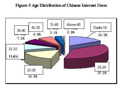 While seeing the great achievements of our informatization construction, it should not be ignored that our development is still far behind the step of the world IT and its application development. There exists an extremely unbalanced development of China?s informatization especially the information gap between different regions, city and countryside, and different ethnic groups. Take 100 as the average of the whole, the Internet popularity rate of the East, the Middle and the West is 197:45:32, the per capita telecommunication service 182:71:49, the phone users are respectively 195 million, 110 million and 70 million, holding a percentage of 52 percent, 29.3 percent and 18.7 percent respectively. There is considerable and enlarging disparity in information for city and countryside. The city penetration rate in 1990 was 1.78 percent while that of the countryside was 0.17 percent, the former being only 1.61 percentage points higher than the latter. But by 1998, the former was up to 19.19 percent while the latter was only 3.92 percent, the former was 15.27 percentage points higher, a gap obviously wider than that in people?s income. At present, there is only 0.3 percent of network users are farmers, that is to say, the city popularity rate is 740 times of that of the countryside. Majority rural population especially those in the Middle and West regions is marginalized in the revolutions of information and network, which caused a new situation of poor-knowledge and poor-information population in this new century. That will largely threaten agriculture modernization and rural industry structure readjustment. The following figure displays the regional, educational and age difference of China?s Internet users, whose data comes from The 10th China?s Internet Statistics Report written by the State Statistics Bureau and the CNNIC in July 2002.
