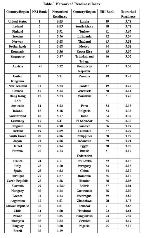 Searching in the world Internet, we can easily find a great number of special websites and articles regarding the digital divide. Many international organizations such as World Bank and its subordinate infoDev, UNDP, UNESCO, OECD and so on have all organized large-scaled surveys and discussions regarding the digital divide in recent years. This year, the World Economy Forum published ?The Global Information Technology Report 2001-2002?[1]. This report delivered 65 quantifiable variable statistics focusing on 75 main countries or regions in the world, and a comprehensive index -- Networked Readiness Index, the result of the weighted average of those data. Among those 65 variables, 20 are called Hard Variable with directly quantifiable data, 45 Soft Variables with quantifiable data after sample investigation by questionnaire. These variables include not only the present statistical data on the application of information and communication technology of different countries, but also an potential index accessing to informatization society, which is measured on the basis of the economic growth, education, government?s attention, and the information infrastructures situation of an country. Though there exists a few indexes with certain prejudice, the report is really the most comprehensive and complete statistical report measuring the informatization of all countries so far. In this report, there forms a line according to the above variables or indexes for the world?s 75 main countries and regions, including HKSAR and Taiwan, representing 80 percent of the world population and 90 percent of the total output. Table-1 is the informatization index from the weighted average of 65 variables standardizing from 1 to 7 and the line of 75 countries and regions. (To the statistics of total data and line, please go to [1])