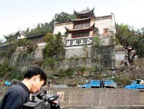 Tourists said farewell to the ancient general's old home at the foot of Feifeng Mountain yesterday. The temple is now closed and ready to move to its new place in Panshi township of Chongqing, according to Wen Xiaohua, an official with the Cultural Relics Administration of Yunyang County.