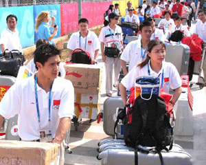 Among the first main batch of the Chinese delegation were chef-de-mission and Chinese Olympic chief Yuan Weimin and athletes in 16 sports, namely shooting, archery, table tennis, diving, swimming, weightlifting, fencing, softball, women' s handball, field hockey, boxing, judo, wrestling, cycling, tennis and beach volleyball.