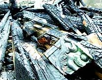 The remains of the roof beams of the 187-square-meter hall are blackened. A portion of the eastern roof ridge is still covered with gray tiles, but the remainder has collapsed and only a charred frame remains of the building.