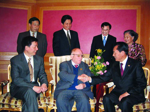 Approaching the year 2005, with leaders of the China International Publishing Group: Cai Mingzhao (first right, front), Vice Minister of the State Council Information Office and President of China International Publishing Group, vice presidents Zhou Mingwei (first left, front), Guo Xiaoyong (second left, rear), Huang Youyi (second right, rear ) and Qi Pingjing (first left, rear).