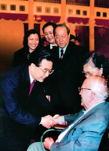 President Hu Jintao, who is also General Secretary of the CPC Central Committee, greeting Israel Epstein at the 2004 National Day Banquet.