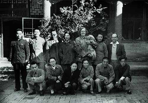 editorial board members in a courtyard in the 1950s.
