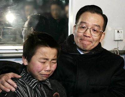 Wen arrived in the Tongchuan Mining Bureau on New Year's Day to visit family members of miners who had died in the Chenjiashan Coal Mine gas explosion on November 28. In the evening, he called a meeting of local leading officials and experts to discuss the improvement of safety.