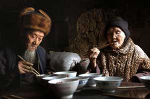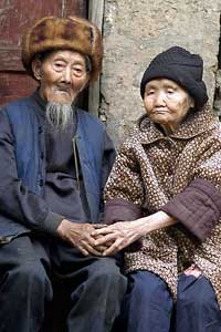 Zhu Yingzhou (L) and his wife Xiong Fazhen pose in the village of Fengtang in Qingzhen city in southwest China's Guizhou Province May 24, 2005. Zhu, 102, and Xiong, 103, have been married for nearly 90 years, according to local police. Xiong married Zhu when she was only 13. They have three sons and three daughters, with the oldest daughter now 81 years old. Picture taken May 24, 2005.