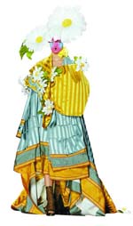 An oversized blush pink coat with embroidered blue flowers bulged over a ruched pink chiffon evening dress. A huge flower sprouted from inside the deep folds of a lime green and gold striped coat.