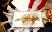 Employees of the British National Natural History Museum carefully move a sample of Dino-Bird fossil in London May 21, 2002. The fossil, with 12 others of Dino-Bird which was the 120 million-year-old bird believed to have derived from meat-eating dinosaurs, arrived in London May 20, to be on display to the public on July 18. The fossils were discovered in northeast China's Liaoning Province.
