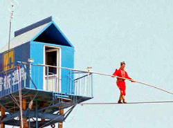 Uygur acrobat Ahdili started his planned 22-day tightrope walking adventure yesterday morning 35 meters above Jinhai Lake in Beijing's Pinggu District in an attempt to challenge the Guinness world record of 21 days set by a Canadian last year.