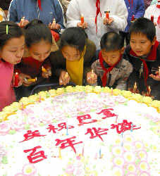 Students of Dongchenggen Street Primary School light up candles on a big cake specially for Ba Jin to celebrate the 100th anniversary of his birthday in Chengdu, capital of southwest China's Sichuan Province, Nov 24.