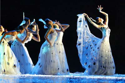 The peacock is the totem worshiped by the Dai people. Based on the Dai's folk dance imitating the peacock, Yang's peacock dance highlights the vitality and elegance of the noble creature. Her slim and long fingers well imitate the peacock plumes while her slender figure vividly portrays a live peacock.