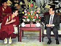 | Senior Chinese leader Li Ruihuan Saturday offered congratulations to Bainqen Erdini Qoigyijabu, the 11th Panchen Lama, on his 12th birthday at a meeting between the two in Beijing just before the traditional Chinese Lunar New Year and the Tibetan New Year, known as the Year of the Iron Snake by the Tibetan calendar. |