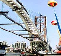 | A steel rainbow crosses over the Huangpu River in Shanghai, as the final gap in the arch of the Lupu Bridge was filled yesterday. The 3,900-meter-long Lupu Bridge is expected to be completed and open to the public in May 2003, relieving traffic congestion at the river crossing. |
