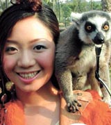 Zhang Shaohan gives a jittery smile as a raccoon perches on her shoulder during a sightseeing tour of a zoo in Guangzhou, capital city of Guangdong Province.