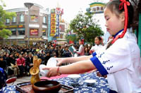 The photo shows that a girl gives a cultural performance concerning tea at the opening ceremony of the Shanghai Tea Festival held in the city?s Nanjing Road on March 26, 2002.