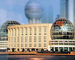 The architecture, with two prominent balls as the globe, was designated one of the 10 scenic spots of Shanghai.