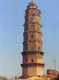 Fenghuang Pagoda, an octagonal, seven-storey structure of brick and stone, is some forty-five meters high. The first and second storeys are built of rectangular stone slabs and the others of brick. Inside the pagoda stone steps along the wall lead to the first and second floors. Starting from the third storey a winding staircase in a passageway in the double-layer walls leads to the top, but the sixth and seventh storeys have only three, instead of four, doors. There are three niches on the southern side of the sixth storey, while the seventh has only one.