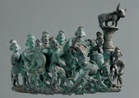 The bronze sculptures feature vivid scenes of local farming, hunting, weaving and dancing and the spectacles of ritual ceremonies and battles. They have been found on the lids of cowrie containers, the covers of the bronze drums and other decorative wares and models.