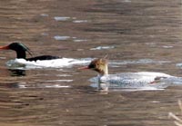 Two Chinese mergansers take a swim in the Yalu River, in northeast China's Jilin Province. Eleven of the endangered birds appeared on the river this spring.