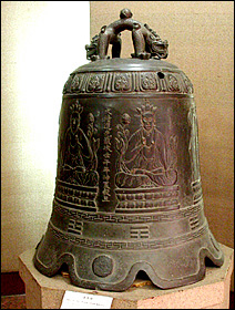 The bell has unique decorative patterns. Four relief images of Buddha were cast around the surface of the bell. They are almost as tall as the bell itself. The black bronze bell, smooth and shiny, is of superb quality. It is 1.06 meters in height, 0.84 meter in rim diameter and 252 kilograms in weight.