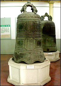 You can find this bell at the exhibition hall "A Brief History of Ancient Bells." It is 1.70 meters in height and 452 kilograms in weight. An inscription on the bell says that the bell was cast devoutly by Wei Zhongxian, a eunuch who was in charge of not only the Eastern Chamber (imperial secret service headquarters) but all the incoming petitions and memorials as well. He was given a free hand to place his diehard followers in the Six Boards and the offices of the governors and governors-general. Altogether they formed a eunuch clique. They ruthlessly persecuted persons whose names they had on a list. The bell also bears a line: "Long live the present Emperor! A long, long life to him!"