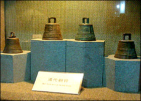 In the second exhibition hall of a forest of bells, you can find more than 100 small bronze bells dating back to the Ming and Qing dynasties. They include a set of four small bronze bells cast during the Qing Dynasty. Each bell has an inscription of si ji (four seasons) ping an (safe and sound) in regular script. One bell is bigger than another. Their bottom rim is flat. If the four small bells are spaced out, they look gorgeous like four small pyramids.