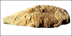 Monstrous beast eating a sheep With short body and long legs, square head and a pair of horns, and sharp fangs, this monstrous beast appears fierce and cruel. It has a sheep in its claws and is eating despite the sheep's resistance. Unfortunately, the sheep is helpless and doomed. This statue made use of an irregular stone 274 centimeters long and 220 centimeters wide. By means of a relief technique, beast and sheep are clearly defined, though their images are in the same stone.