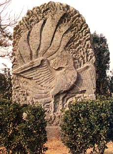 Especially exquisite are stone phoenixes at Yongzhao Mausoleum. On either rectangular stone screen is a carved phoenix spreading its wings, with beautiful lotus petal-shaped flowery tail-feathers like a new fan moving wind and clouds. As a background to the stone phoenix, a panorama of mountains form deep, tranquil valleys, and the cliffs are dotted with mysterious ancient caves, so that people looking at them feel as if they are facing natural scenery. All these show that Song Dynasty stone sculpture reached an advanced stage of maturity.