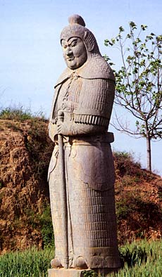 The Yongxi Mausoleum is an example. The sculpted human figures are vivid in expression and social status is truthfully depicted. For example, the eunuchs are full checked, broad of forehead, reverent and respectful, holding the horsetail whisks, very carefully awaiting the emperor's call; the chuanlu, with square faces and large ears, are immaculately dressed with one hand hanging down, the other on their chests, concentrating their attention awaiting imperial orders; the zhendian generals, holding swords, helmeted and armored, round faced and large-eyed, gaze ahead militantly. Sculptors mostly favored, smooth, round carvings, supplemented by level, straight segments.