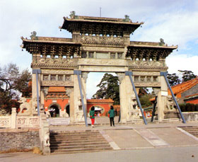 The overall arrangement of this cemetery is the same as Fuling. The graves are surrounded by rectangular walls, and the red entrance gate is located in south center. Outside the gate are tablets ordering dismount from horses, ornamental columns, stone lions and a stone bridge, as well as a memorial archway built in the 6th year of the Jia Qing reign. The memorial archway lies in the center outside the door. It is exquisitely carved with high art value.