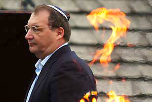 A participant of the "March of the Living" passes by a torch mourning the victims in World War II at the site of the Auschwitz Concentration Camp set up by Nazi Germany in Auschwitz, Poland, May 5, 2005.