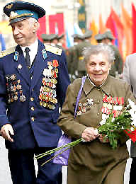 World War Two veterans walk during a procession in central Moscow, May 8, 2005. Russia will mark the 60th anniversary of the former Soviet Union's victory over Nazi Germany in World War Two on May 9. (Xinhua/Reuters Photo)