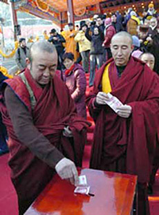 Buddhists make donations at a prayer service in Beijing January 1, 2005. Buddhists from the Chinese mainland and Taiwan have donated a total of 9.93 million yuan (US$1.2 million) in the prayer service to the tsunami-hit countries in Southeast Asia.