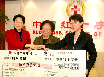| Peng Peiyun (C), president of the Chinese Red Cross Society, Su Juxiang (1st L), vice president of the Chinese Red Cross Society, and Wang Xiaoyan, senior vice president of China's Lenovo Group Ltd., pose for a photo behind a symbolic check during a money donation activity held in Beijing Jan. 4, 2005. The Lenovo Group Ltd. donated 500,000 US dollars for the tsunami-stricken nations. |
