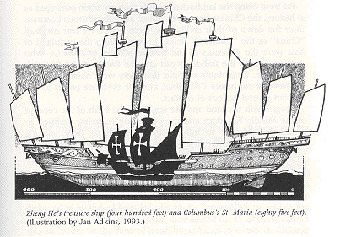 A comparision of Zheng He's flagship (Baochuan) with Christoper Columbus' Santa Maria show the great difference in size between the two vessels.
