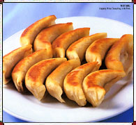 3. Put the cooking oil into the frying pan, heat and when the oil is about 135-200oC (275-390oF), place the raw dumplings in. Heat for one minute, sprinkle 100 g (6 tbsp) of water and put on the pan cover. Use strong fire to heat five minutes. When the water disappears, the dumplings are ready. (It may take several repetitions to cook all the 40 dumplings because of the size of the pan.)