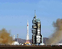 Amidst deafening roars, the Shenzhou V manned spacecraft was lifted into the sky by a Long March-II-F carrier rocket. Both the spacecraft and the carrier rocket were designed and built by China independently.