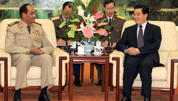 During the meeting with Tantawi, Hu said that China attaches importance to the role of Egypt in regional and international affairs, and will work with Egypt to further the strategic cooperation between the two countries and push forward bilateral military and state relations to a new height.